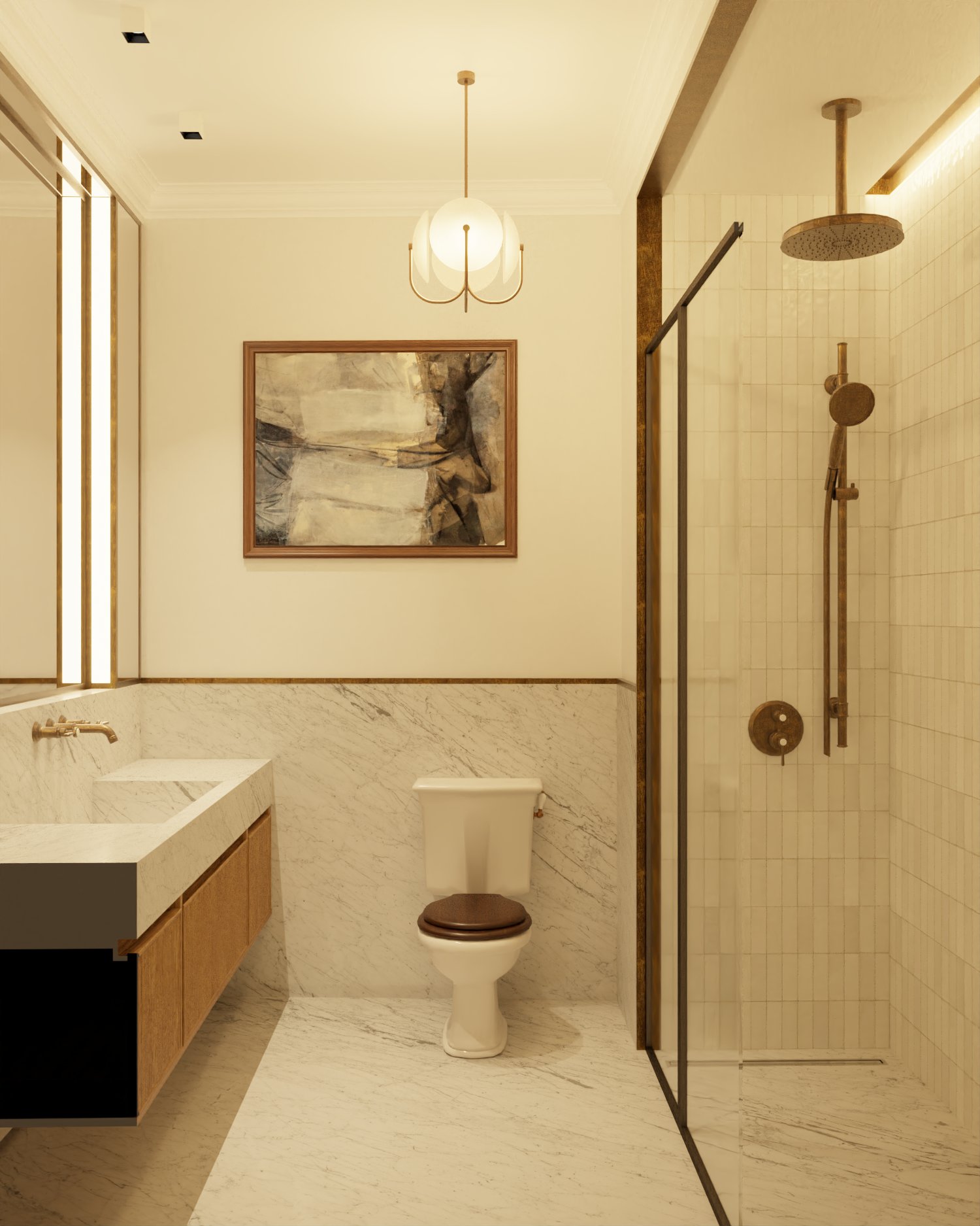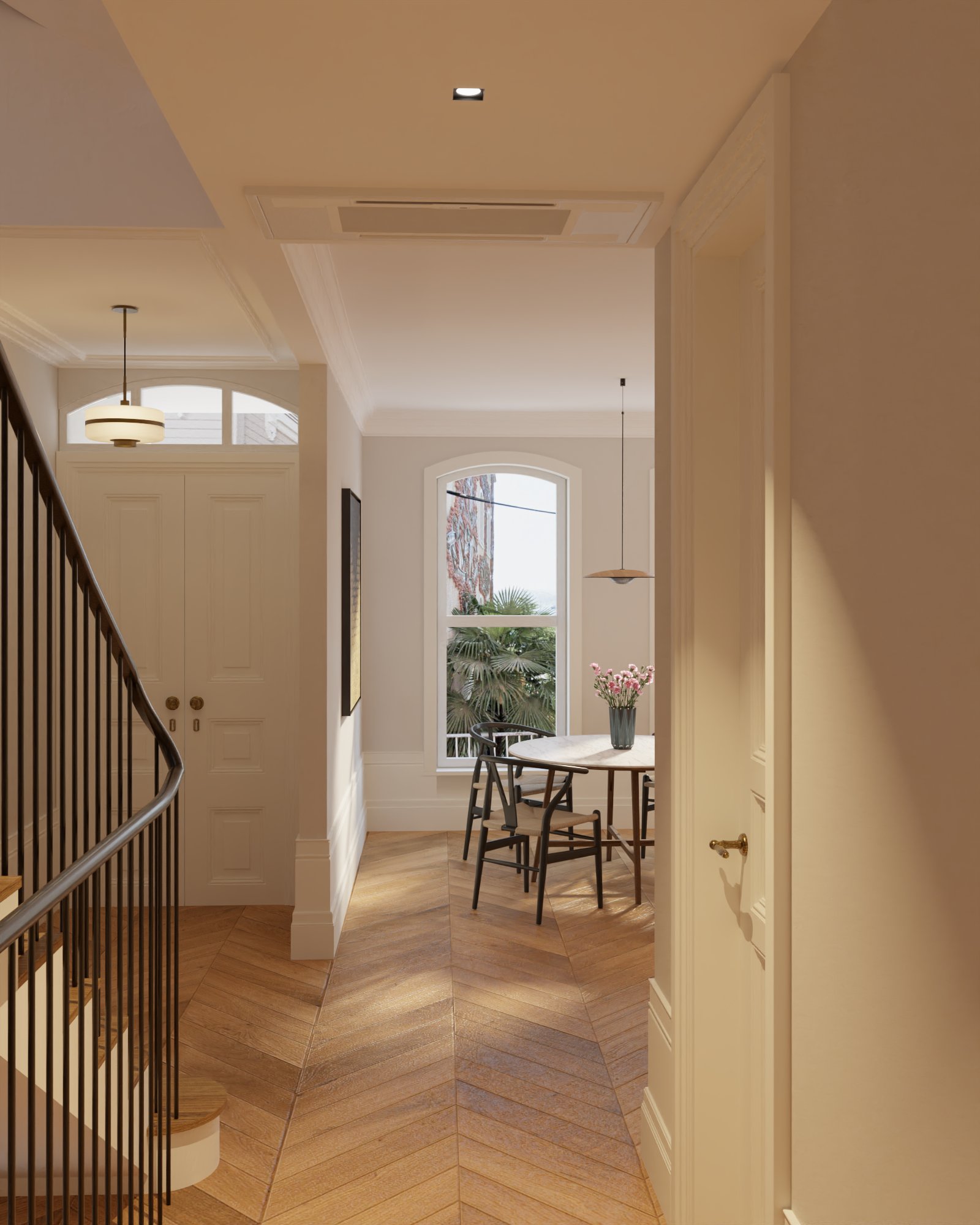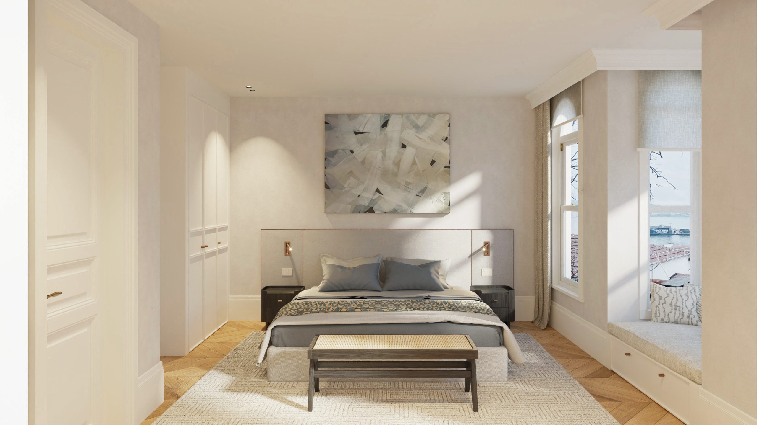 Yenilikçi klasik tarzda yenilenen evin tasarımındaki hedef sıcak ve davetkar bir atmosfer yaratarak rafine, işlevsel ve yaşanabilir alanlar oluşturmak. Bu hissi oluşturmak için birden fazla katman kullanıldı; el yapımı karolar, farklı mermerler ve çeşitli ahşap kaplamalar bir araya getirildi. Antika halılar ve çağdaş kumaşlar aynı çerçeveye yerleştirildi.