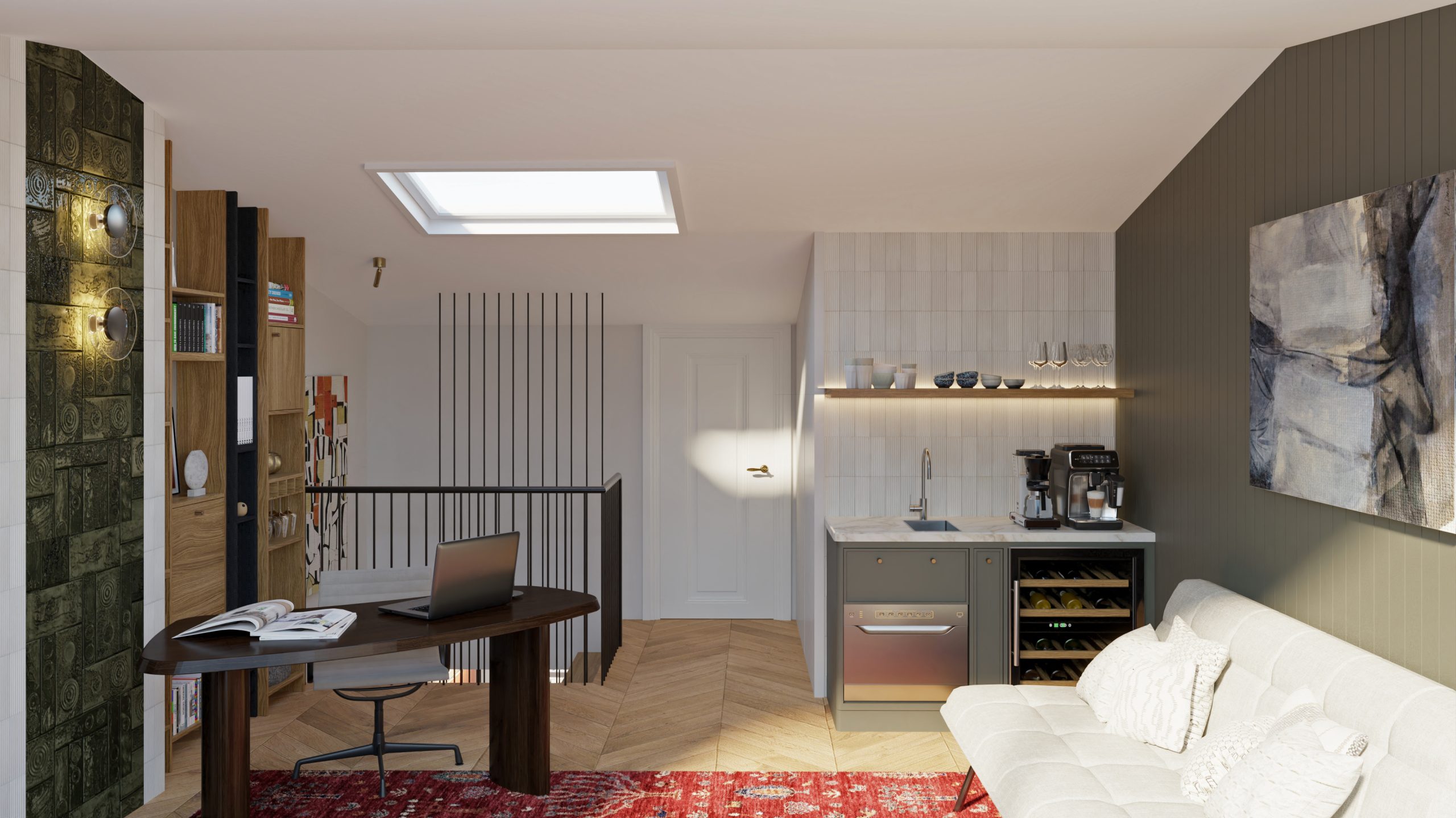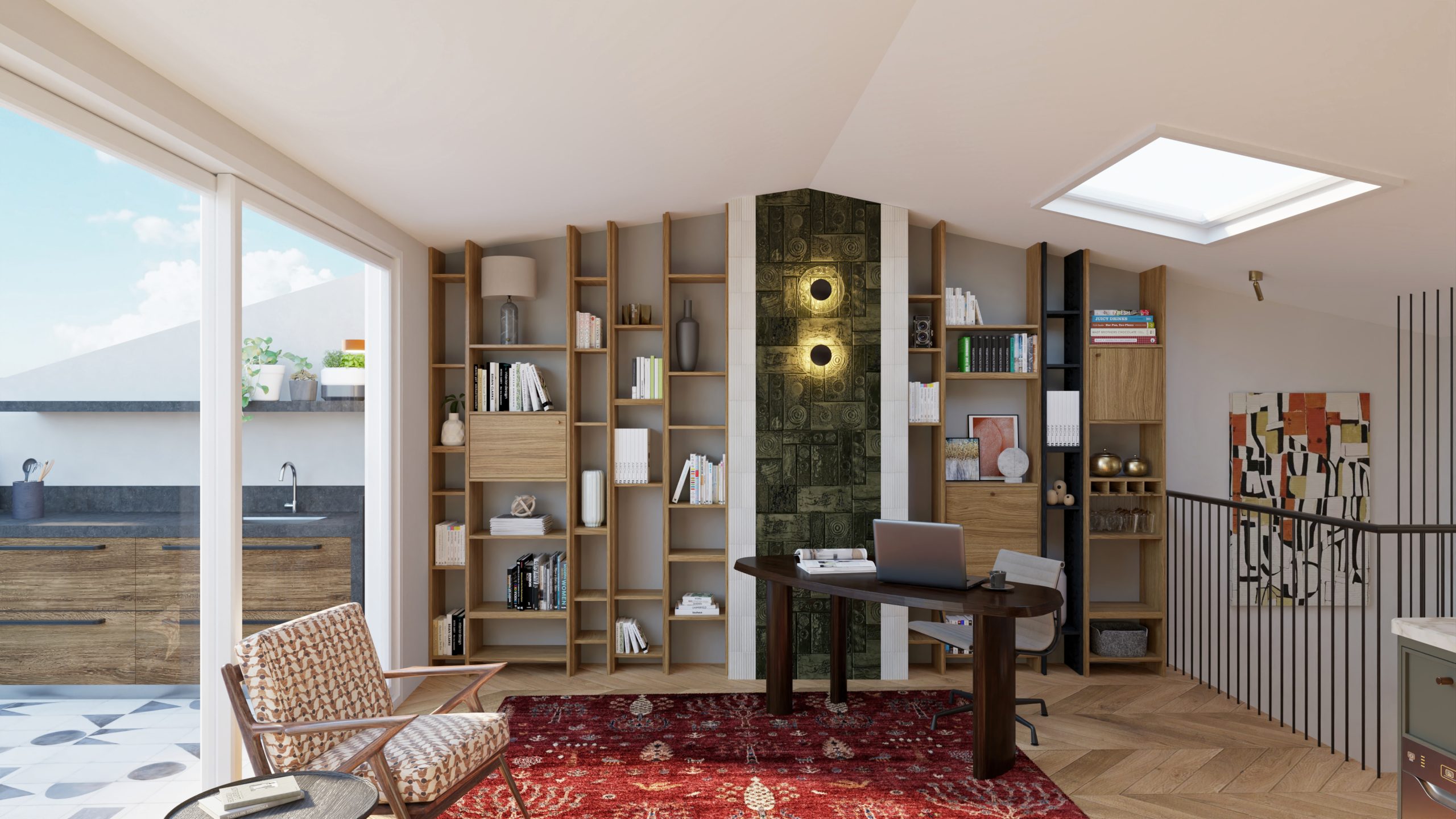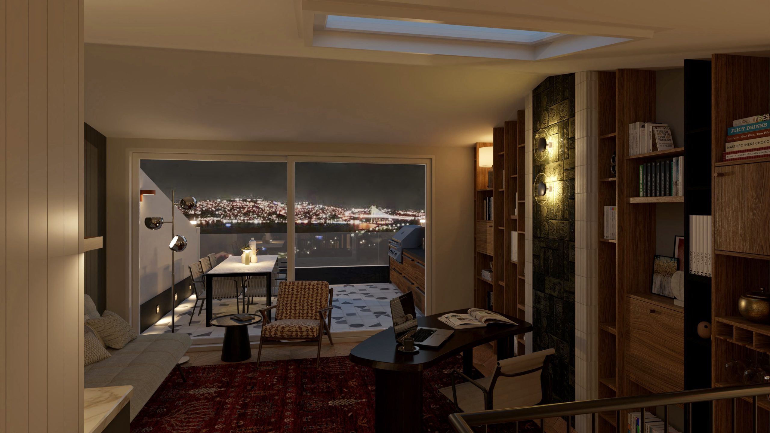 Minimum alanda maksimum fonksiyon amaçlanan bu çatı katında teras, oturma alanı, çalışma alanı, küçük bir kitchenette ve WC bulunmaktadır. Evin kalbi olarak düşünülen bu mekan özel tasarım bir kütüphane, el yapımı seramikler ve İran halısı gibi ögelerle zenginleştirilmiş ve keyifli bir yaşam alanı sunması hedeflenmiştir.